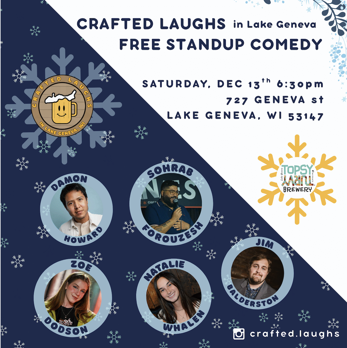 Topsy Turvy Brewery 727 Geneva St, Lake Geneva, United StatesCozy up to some of the best Stand Up Comedy Chicago has to offer, for free!! Grab a beer, seltzer, cocktail, or N/A drink of your dreams from the bar and sit down for an hour & a half of absurd hilarity.
